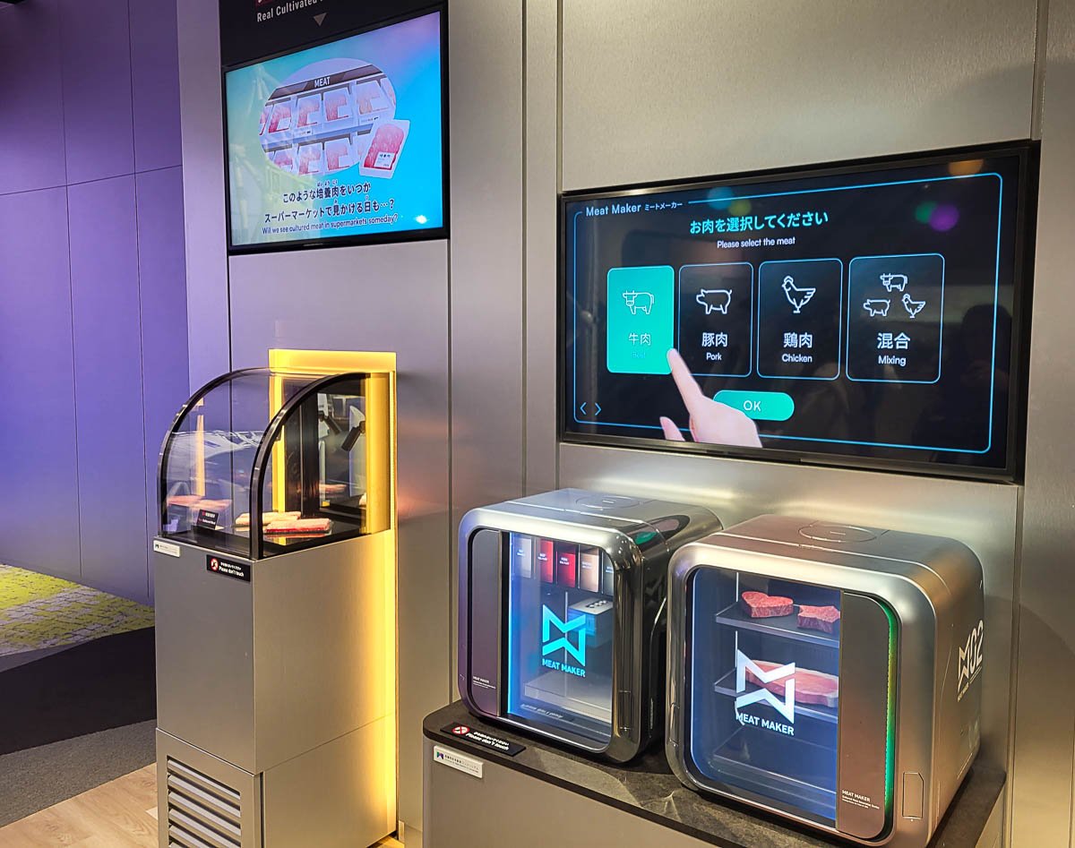 Impresoras 3D creando carne cultivada capa por capa, utilizando cartuchos con tejido muscular y graso, como parte de una demostración tecnológica en la Expo 2025 de Osaka
