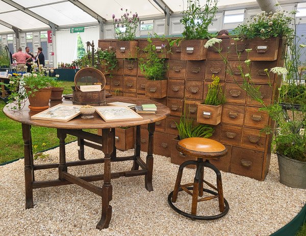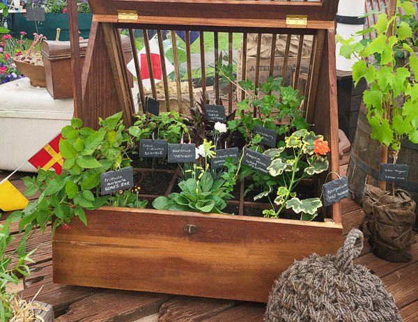 De izquierda a derecha: armario con plantas (Kent Wildflower Seeds), estuche Wardian (Brunel’s SS Great Britain), y una siesta entre hostas.